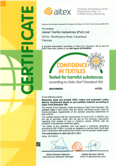 OEKO TEX 100 Certification: Achievement of OEKOTEX 100 Certificate, validates Jamal Textile,Inc commitment for using human friendly dyes and chemicals in product manufacturing.